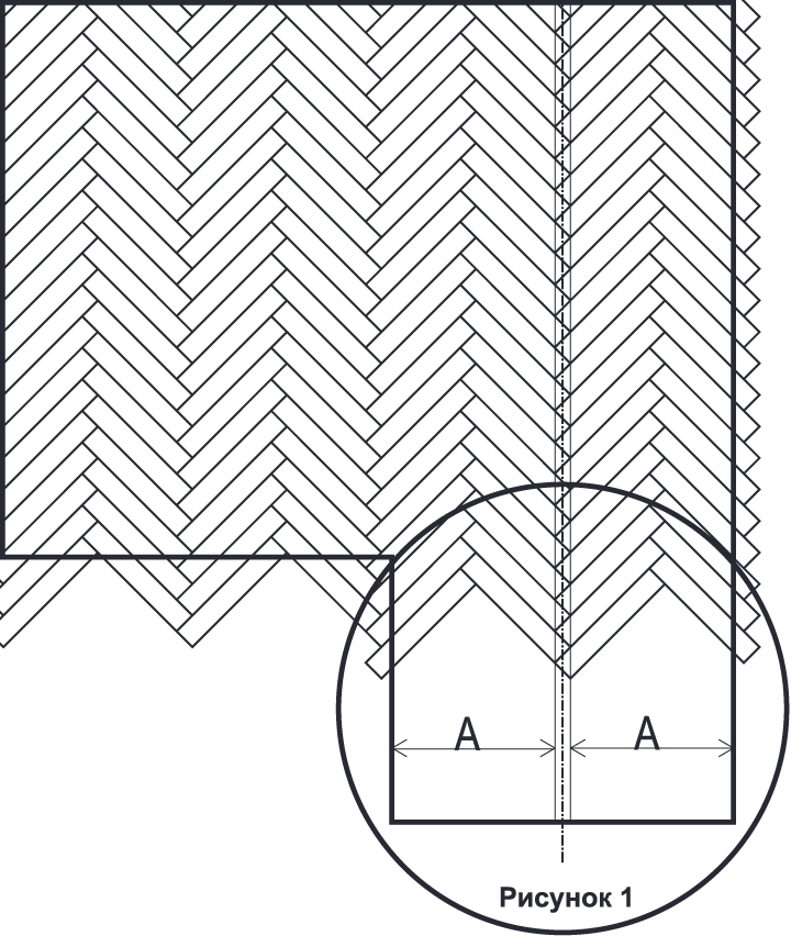 Основной задачей при разметке под укладку «Ёлочкой» является нахождение центральной оси, относительно которой будет идти укладка, чтобы учесть все подходы к стенам относительно углов в помещении и симметрии готового рисунка там, где это необходимо. Например, если важна симметрия при укладке вдоль узкого коридора, то необходимо нарисовать две линии, которые зададут центральную ось. Линии размещают на равном расстоянии «А» от стен коридора, таким образом задавая симметрию (Рис.1). В зависимости от сложности геометрии помещения возможно разнообразное размещение центральной линии и привязки рядов укладки. Старайтесь не оставлять слишком маленькие элементы вдоль стен.