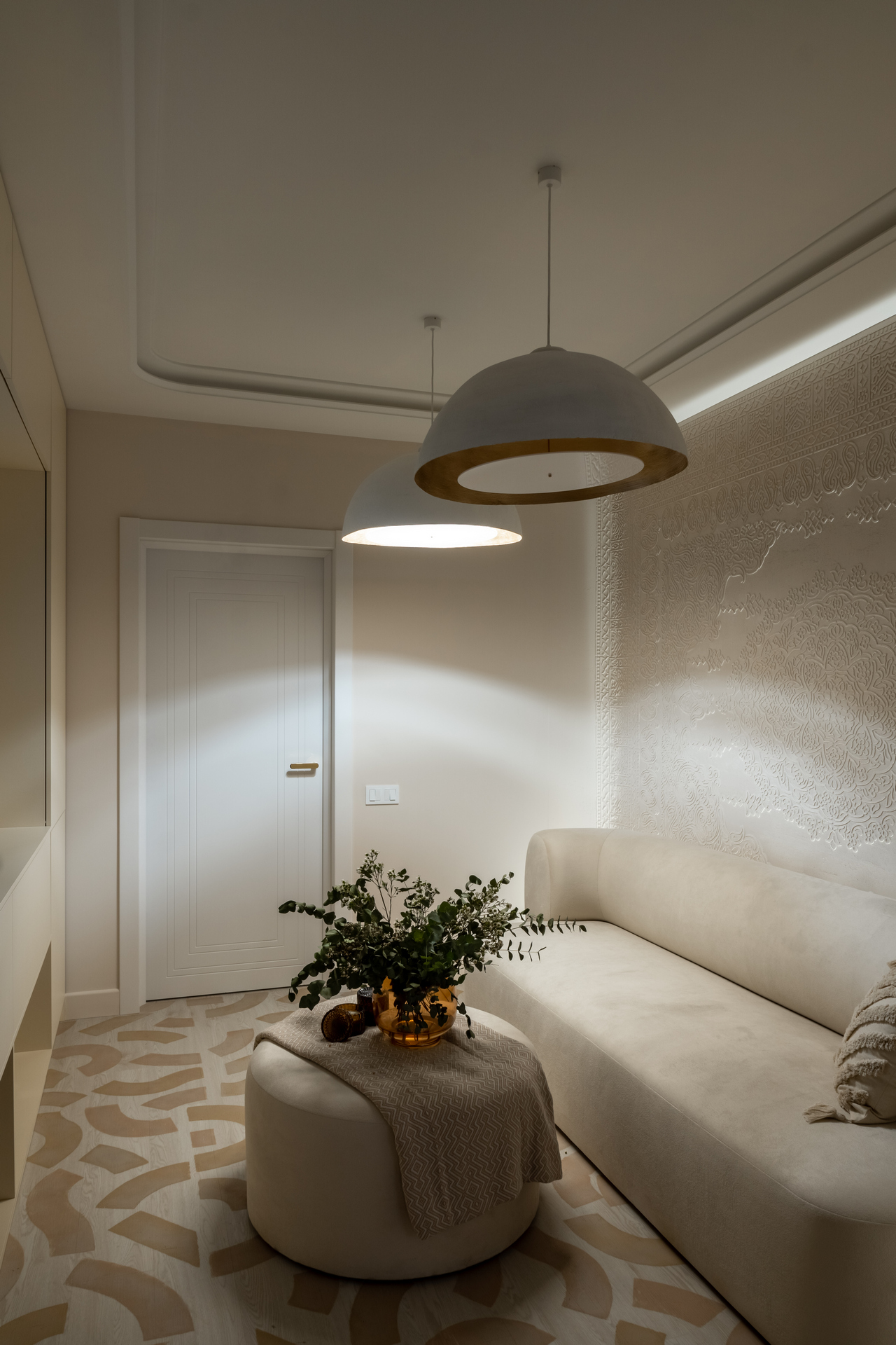 Пол — особая «фишка» этого проекта. На кварцевом ламинате Fargo Comfort Ясень Белый JC18001-35 с помощью трафаретов оформили узоры, сделав пол акцентом.