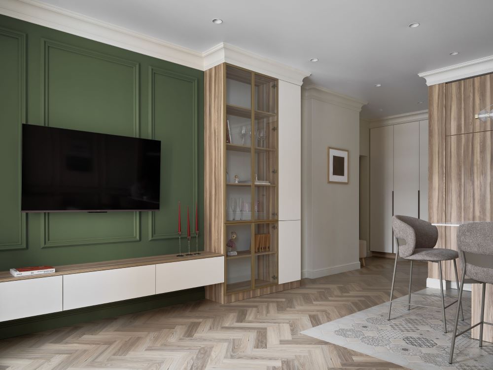 Классика этого интерьера читается в деталях — филёнках на стенах, широких карнизах и спокойной симметрии. Пространство звучит современно и легко, как продуманная композиция без лишних нот. Акцентная стена в цвете хаки добавляет интерьеру глубину и гармонично объединяется с тёплым деревом в отделке.